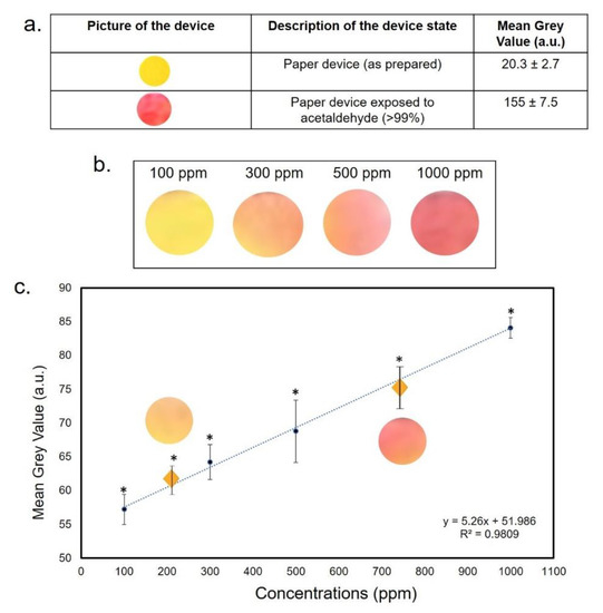 (a) MGV values of PAD as-prepared and after the exposure to pure C2H4O (>99%). (b) color change after C2H4O exposure. (c) Interpolation of C2H4O intermediate values (200 and 750 ppm). Data reported were the average of three independent experiments ± SD. The difference between the as-prepared paper and colored papers was considered statistically significant performing a Student’s t-test with p < 0.05 (<0.05 *).