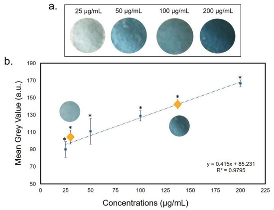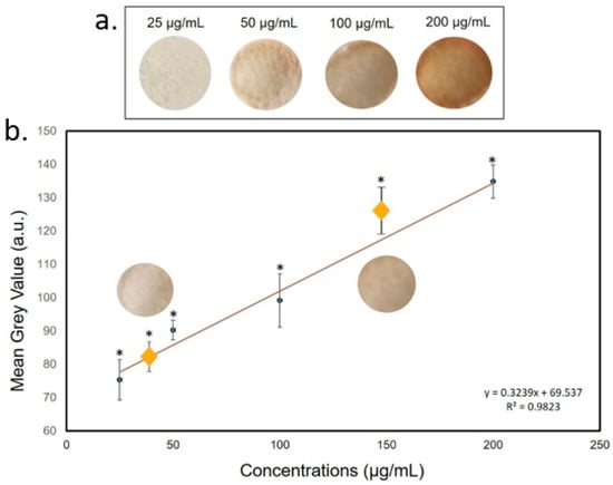(a) Color change of filter paper after exposure to Cu(II) at different concentrations. (b)The yellow rhombuses represented the interpolation of Cu2+ intermediate concentrations (37 and 150 µg/mL). Data reported were the average of three independent experiments ± SD. The difference between as-prepared paper and colored papers was considered statistically significant performing a Student’s t-test with p < 0.05 (<0.05 *).