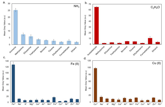Interferences assay for NH3 and C2H4O (a,b) and Fe(II) and Cu (II) (c,d). The values were expressed as MGV. Data reported were the average of three independent experiments ± SD.