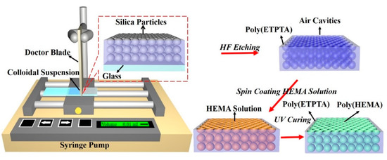 Fabrication of Macroporous Poly(HEMA)/Poly(ETPTA) Photonic Crystals. The silica colloids embedded in the polymeric composite were wet-etched by immersing in an aqueous hydrofluoric acid solution (2 vol.%) for 5 min to create macroporous poly(ETPTA) photonic crystals. The macroporous film was peeled off from the glass substrate and immersed in an ethanol-based mixture of HEMA monomers (14.5 vol.%), MMA monomers (0.4 vol.%), EG monomers (0.1 vol.%), and AIBN (1 vol.%). The final monomer volume fraction was controlled to be 15 vol.%. In the mixture, MMA monomers and EG monomers can serve as a polymeric toughener and a lubricant, respectively. After eliminating excess mixture by spinning at 1000 rpm for 1 min, the monomers were photo-polymerized by ultraviolet radiation in the curing system for 2 s to engineer a free-standing macroporous poly(HEMA)/poly(ETPTA) photonic crystals.