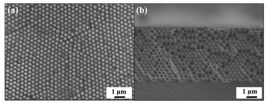 (a) Top-view SEM image of a doctor-blade-coated 335 nm silica colloidal crystal/poly(ETPTA) composite. (b) Cross-sectional SEM image of the sample in (a).