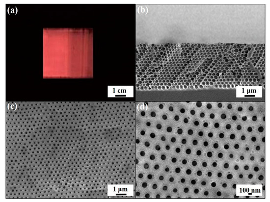 The experimental procedures for engineering macroporous photonic crystal-based insecticide vapor detectors are schematically illustrated in Figure 1. Silica colloidal crystal/poly(ETPTA) composites are self-assembled by a scalable doctor-blade coating technology, whereas the silica colloids are shear-aligned in the coating process, followed by a photo-polymerization procedure [35]. Apparently, the silica colloids, embedded in the poly(ETPTA) matrix, are three-dimensionally and hexagonally close-packed in a long-range ordering (Figure 2). The embedded silica colloids can then be selectively wet-etched using an aqueous hydrofluoric acid solution, while the film can be gently peeled off from the substrate to create free-standing macroporous poly(ETPTA) photonic crystals. As displayed in Figure 3, the macroporous film templated from 355 nm silica colloidal crystals exhibits a shining vermilion color, caused by light reflection from the three-dimensionally ordered macroporous structures. It is noteworthy that the hexagonal close-packed lattice is well retained after the wet etching treatment. The macroporous film can be immersed in an ethanol-based mixture of HEMA monomers, EG monomers, MMA monomers, and AIBN, while the excess monomers are removed in a spin-coating procedure. The monomers are finally photo-polymerized by ultraviolet radiation to engineer a free-standing macroporous poly(HEMA)/poly(ETPTA) photonic crystals.