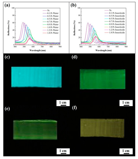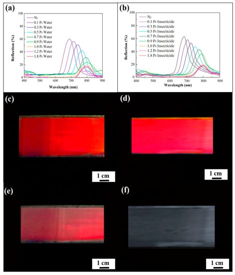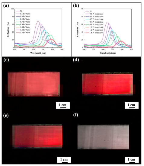in which and d denote the effective refractive index of the medium and the lattice spacing, respectively [36]. This result further demonstrates the long-range ordering of the air cavities in the macroporous photonic crystals. Importantly, water vapor condenses in the cavities, leading to a higher and a lower refractive index contrast between poly(ETPTA) and the enclosed material. As a result, the peak position gradually red-shifts to 788 nm, during which the peak amplitude gradually declines as the water vapor pressure increases from 0 P0 to 1.0 P0, whereas P0 represents the saturation water vapor pressure at 28 °C. Additionally, the changes in the peak position and amplitude were not obvious when the water vapor pressure was higher than 1.0 P0. Owing to the fact that the water-based insecticide is composed of a considerable proportion of water, the optical response of the insecticide vapor detecting is similar to that of water vapor detecting (Figure 4b). It was noticed that the reflection peak position shifts from 648 nm to 789 nm, while the corresponding appearance of the film changes from vermilion to colorless as the insecticide vapor pressure reaches 1.0 P0 (Figure 4c–f).