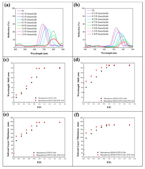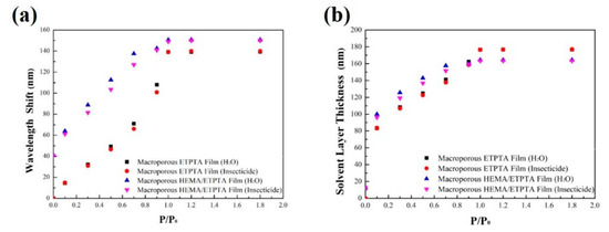 Since the detection selectivity between water vapor and water-based chemical vapor is not obvious, the water-soluble chemical vapor detecting capability of the macroporous photonic crystals under actual conditions was investigated by evaluating the optical responses under various insecticide vapor pressures in the presence of a fixed water vapor pressure at 0.2 P0 (Figure 7). Interestingly, in comparison with insecticide vapor detection in a dry environment, the presence of water vapor brought about larger red-shifts in reflection peaks for either macroporous poly(ETPTA) film or macroporous poly(HEMA)/poly(ETPTA) film. The insecticide vapor condensation, which was accompanied by water vapor condensation in the macroporous film led to a thicker condensed liquid layer and a higher corresponding than those of insecticide vapor detection without water vapor. The characteristics further enhance the red-shift of reflection peak. Importantly, owing to a high degree of swelling on exposure to water, the increased red-shifts of poly(HEMA) layer coated macroporous film could maintain ca. 12.5 nm under various insecticide vapor pressures. The finding is essential for directly identifying water-soluble chemical vapor pressure even under actual conditions. On the other hand, in the presence of insoluble chemicals in water, the condensed non-water-soluble chemicals are incapable of forming a uniform liquid layer on the poly(HEMA)-coated pores. The nonuniform liquid layer brings about light scattering and therefore greatly suppresses the intensity of reflective light.