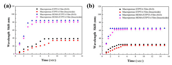 Change of reflection peak position shift with time for a macroporous poly(ETPTA) film table 250 nm silica colloidal crystals and a macroporous poly(HEMA)/poly(ETPTA) film templated from 250 nm silica colloidal crystals under (a) 0.5 P0 vapor pressure and (b) 0.2 P0 vapor pressure. P0 represents the saturation insecticide vapor pressure at 28 °C.
