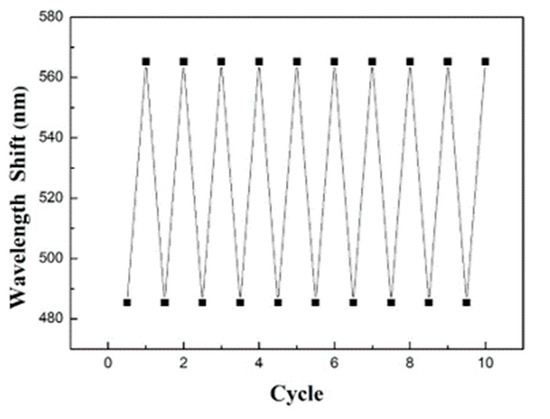 It is worthy of attention that the water-based insecticide does not chemically react with poly(HEMA), and thus the condensed insecticide can straightforwardly be removed by water rinsing. Taking advantage of that, the optical properties of the as-engineered macroporous poly(HEMA)/poly(ETPTA) photonic crystals can be wholly recuperated, and the recovered macroporous film can be reused for water-soluble chemical vapor detecting. The reproducibility of insecticide vapor detecting was investigated utilizing a macroporous poly(HEMA)/poly(ETPTA) film templated from 250 nm silica colloidal crystals. The reflection peak red-shifted from 485 nm to 566 nm as the macroporous film was exposed to saturated insecticide vapor and then blue-shifted to 485 nm after a raising treatment. Importantly, the utilization of macroporous poly(ETPTA) scaffold limited inhomogeneous deformation of poly(HEMA) coating layer during the cycles. As shown in Figure 10, the conversion was reversible and repeatable for at least 10 cycles, suggesting that the macroporous photonic crystals provide a reproducible platform for water-based chemical vapor detection. It is worthwhile to note that as compared with the macroporous poly(HEMA)/poly(ETPTA) film templated from 250 nm silica colloidal crystals, the response time and the reproducibility of the film templated from 355 nm silica colloidal crystals did not change. The response time is mainly determined by the Gibbs free energy change for mixing coated polymer with analyte chemicals. Owing to a favorable Gibbs free energy change for mixing poly(HEMA) with water, the poly(HEMA) coating layer is capable of absorbing condensed water and leads promptly to the formation of uniform condensed liquid film. In addition, the use of macroporous poly(ETPTA) as a scaffold presumably limits inhomogeneous deformation of poly(HEMA) hydrogel during the cycles, resulting in a great reversibility for water-based insecticide vapor sensing.