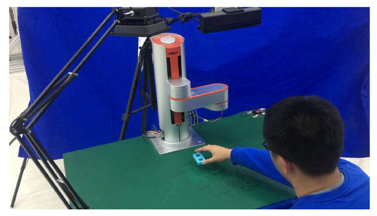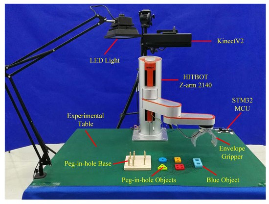 The 4-DOF SCARA type cooperative industrial manipulator named HITBOT Z-arm 2140 was selected to demonstrate the proposed task-learning strategy with the experimental setup shown in Figure 4. The end-effector was equipped with a 1-DOF gripper, which was driven by a servo motor and controlled by an STM32 microcontroller (MCU) to achieve envelope grasping. Task-relevant objects included a blue object, peg-in-hole objects, and peg-in-hole base. The KinectV2 was mounted on the top with a LED light provided for supplementary illuminations.