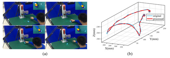 Data acquisition and preprocessing for pick-and-place operations. (a) Snapshots of human demonstration with the Kinect FORTH system. (b) The original data after calibration with the processed data after Moving Average Filter (MAF) and Cubic Spline Interpolation (CSI).