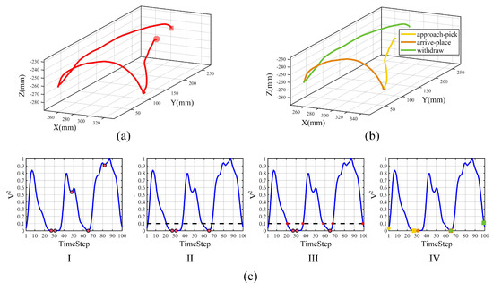 Movement Segmentation results of one demonstration. (a) Original pre-processed trajectory. (b) Segmented trajectory. (c) Movement segmentation process using Algorithm 1. I, II, III, and IV correspond to normalized velocity square sum with local minimum detection, threshold-based elimination, threshold-based intersection, and final segmentation points set, respectively.