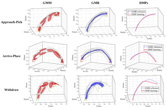 Movement primitives learning results of the approach-pick phase, the arrive-place phase and the withdraw phase in pick-and-place operations. We use Gaussian mixture model (GMM) to encode overall distributions (red ellipsoids) and use Gaussian mixture regression (GMR) to derive the optimal trajectory (blue lines). Dynamical movement primitives (DMPs) are used to learn (red lines) with GMR trajectories as reference (blue dash lines).