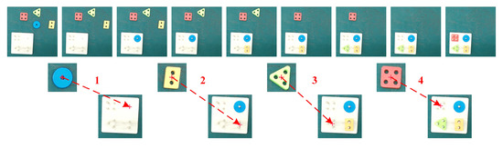 In this paper, goal configurations refer to the actual pick-and-place points in peg-in-hole tasks generalized from the improved VSL algorithm, as a consequence, the success rate of peg-in-hole tasks indirectly reflects the goal configurations generalization performance. In order to evaluate the task success rate, we consider each experiment (see Figure 9) consists of four sub-tasks (blue, orange, green, and red objects, respectively), and the sub-task is considered correct if the robot executes peg-in-hole tasks successfully and failed if the robot does not grasp or release objects correctly during task execution. The success rate of peg-in-hole tasks can be seen in Table 7. Totally, there are 4 filed tasks in 24 subtasks of 6 experiments with a success rate of 83.3%. Note that although we can obtain exact pick-and-place points using the improved VSL algorithm, failures sometimes occur owing to uncertainties of calibration errors or gripping errors. If these errors are out of the range allowed by clearances on the holes, the robot can not execute tasks successfully. To date, the proposed task-learning strategy does not have the ability of automatic error recovery [41] and the ability of real-time obstacle avoidance [42], which needs further improvement in future work.