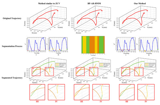 In Figure 11, the first row shows the input original trajectory passed to the method similar to ZCV [12] (the first column), BP-AR-HMM [26] (the second column), and our method (the last column), respectively. The initial points and final points are marked with dot and square. The second row shows the segmentation process of three methods. In the method similar to ZCV, rising edges (asterisk) and falling edges (triangle) are shown in the velocity curve I with II the obtained segmentation points. The start points (dot) and end points (square) are shown in yellow (the approach-pick phase), orange (the arrive-place phase) and green (the withdraw phase), respectively. In BP-AR-HMM, the demonstration is marked with different color bars. In our method, the velocity curve I denotes the heuristic segmentation process based on intersections (asterisk) and local minimums (dot), and II corresponds to the obtained segmentation points. Finally, the last row shows the segmented trajectory with segmentation points indexed to acquire trajectories of different phases. In order to illustrate the movement segmentation results better, local enlarged images are added. Specifically, III and IV denote the areas around the connections of the arrive-place phase and the withdraw phase, the approach-pick phase and the arrive-place phase, respectively.