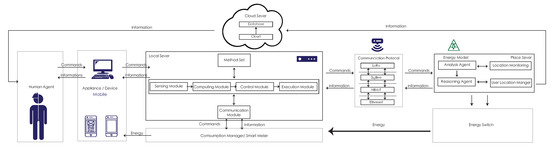 The agent communication framework includes the human agent, an appliance, a local server, a consumption manager, a communication protocol, a place server, an energy switch, and a cloud server. The user is the human agent and it uses an appliance in the physical space. When the local server receives the user’s information, it begins interacting with other agents in the system environment via the sensing module, execution module, and communication module. The local server has a computational model that is responsible for processing and storing the perceived and received messages and a control module using the method and the information processed by the received computing module and the information to communicate with other agents for further analysis and reasoning to make decisions for the communication and execution modules. All of the local server’s data are transmitted to the place server through the communication protocol. The place server includes the agent, reasoning agent, location monitoring, and user location manager. After transferring all of the information to the cloud server, the cloud server records the data and converts it to the human agent to show up and inform the user.