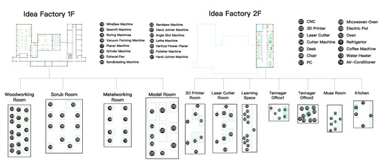 The facilities (Figure 3) are similar to a smart factory. In this factory, we have the co-worker, co-maker, normal office staff, and some part-time participants. For making, the facilitation and management of design, digital, and craft workshops are integrated together to offer a seamless working pipeline. In this implementation space, it has professional equipment, such as carpentry, metalworking, a laser cutter, a 3D printer, CNC, and robotic arms and workshops. This space has the multiple persona, but we will focus on the co-making and co-making user’s behavior. We believe that every behavior can be described, and they not only use the energy, but also generate the energy.