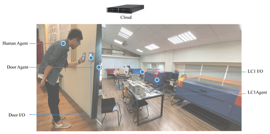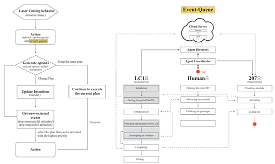 Each agent represents a modular individual reasoning architecture in Figure 5. The advantages of that representation are in the ease of setting up, modifying, and expanding operational reasoning or tactics for various interaction scenarios within the building. Before users (Human Agent) enter the space, they will need to make a reservation on the machine that they are going to use in a time slot with proper dataset. In the laser cutting scenario, a set of paths with option on power and speed for each path need to be remotely input. The event sequence for the communication between the three agents are: