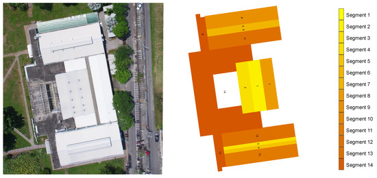 Our exposition for smart energy thus far includes dynamic behaviour of consumption patterns, as described above. To calculate the generation of energy from a solar PV system, the rooftop of the Idea Factory is divided into 14 segments of the hardware system’s distribution in order to calculate it (Figure 7). The building location and roof geometry are used to simulate the solar energy potential to power the Idea Factory. The building model is geo-located while using a latitude/longitude pair or Open Location Code https://github.com/google/open-location-code/blob/master/docs/olc_definition.adoc. The latitude/longitude information can be inputted directly or via the Open Location Code (see google pluscode https://plus.codes/). Using long codes (up to 12 characters long) allows for resolution down to approximately 3.4 by 2.7 m area and they are readily convertible to latitude/longitude.