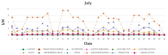 The device’s recorded daily usage can show differences from the original configuration. Device operation, the idle mode, and the shutdown of energy consumption have different effects. Through the data record, the device situation can be predicted beforehand in order to change the device. Thus, all device consumption was recorded for one month to understand and simulate user scenarios (Figure 10).