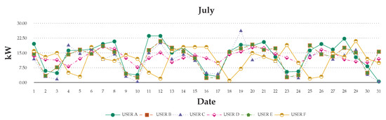 Consumption patterns of the daily usage of the six evaluated users over the month of July.