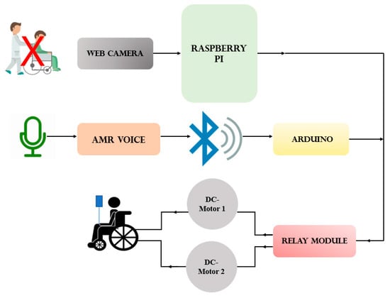 Components of the system model and their interaction with each other are shown as a block diagram (Figure 1). The webcam is fixed to a vertical pole precisely in front of the user’s eye, and this webcam is connected to Raspberry Pi so that it can continuously capture images of the user’s eyeball movement and respond. Raspberry Pi installed with Open CV has an image processing capability and generates an actuation signal. Raspberry Pi is coupled with the motor driving circuitry, which is responsible for directing the wheelchair according to a given command.