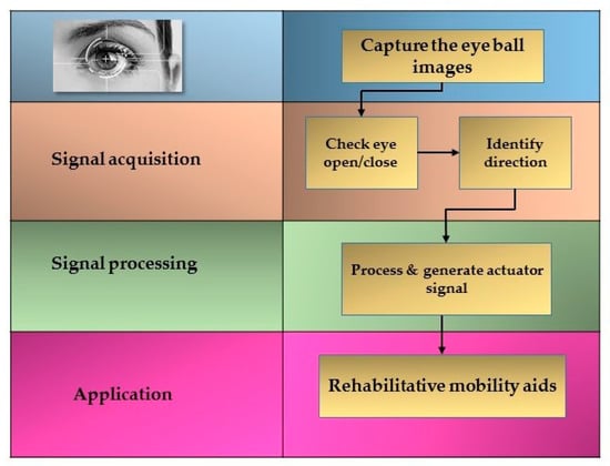 Significant strides made in the fields of rehabilitation, artificial intelligence (AI) (especially around the implementation of complex algorithms for analysis and interpretation of human cognition), and human machine interfaces (HMIs), have opened a new evolutionary pathway for the development of smart mobility aids [1]. People who accidentally lose their lower limbs or suffer from conditions such as quadriplegia or stroke, resulting in paralysis, and muscle stiffness are unable to make use of conventional wheelchairs [2]. Researchers across the world are engaged in developing medical devices/rehabilitation aids for physically challenged populations, such as quadriplegics, to enable them to carry out their daily work without or with minimal assistance from caregivers and nurses, etc. [3]. They are thus increasing the self-esteem and functional capabilities of such patients with the ultimate goal of improving the patients’ quality of life. Biosignals recorded through electroencephalography (EEG), electromyography (EMG), and electrooculography (EOG), etc. [4,5], have been exploited by researchers in developing smart, responsive and real-time rehabilitative control systems.
