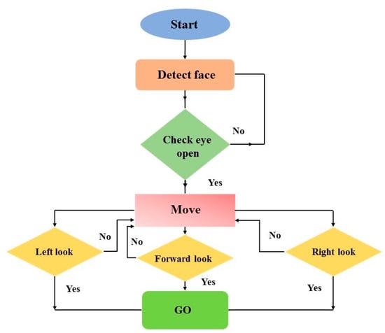 Paths indicate the process flow. For example, after initialization, the system detects the face, and then it checks whether the eye is open or closed, as shown in Figure 3. After this, the eye pupil’s position is identified, i.e., whether the user is looking forward, left, or right. After the eyeball position is identified, this image is processed. Raspberry Pi then generates an actuator signal, which is fed to a switching circuit (relay) to drive the motors accordingly.