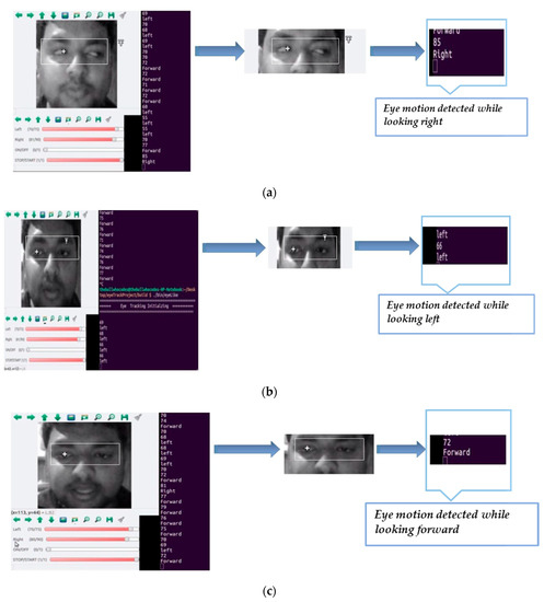Designed system’s results for eye control mode (a) right, (b) left, and (c) forward.