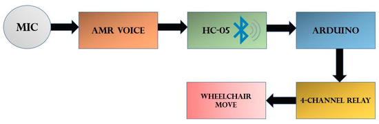 For voice control mode on the wheelchair, the adaptive multi-rate AMR voice app is used with four commands ON (for forwarding), left, right and stop. Arduino UNO is used as the main controller. Other main components of voice control mode are microphone, HC-05 Bluetooth module, and AMR voice recognition. The block diagram in Figure 7 depicts the functionality flow between all components of voice control mode.