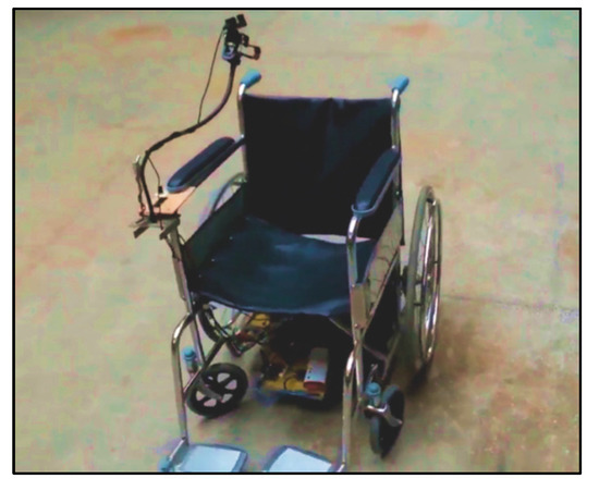 In the present wheelchair design (Figure 8 and Figure 9), all the required components (batteries, motors, controllers and relays) are placed appropriately on a designated platform (length = 12 inches, width = 9 inches, thickness = 5 inches) welded to the wheelchair underneath the seat. A low weight frame is used so that a wheelchair can easily be propelled. Total weight of wheelchair is 17.35 kg (frame = 14.5 kg, other components = 2.85 kg). Further, the camera is located in such a position so that the user can easily gaze into the camera while remaining in the comfort zone, thus avoiding any tiredness.