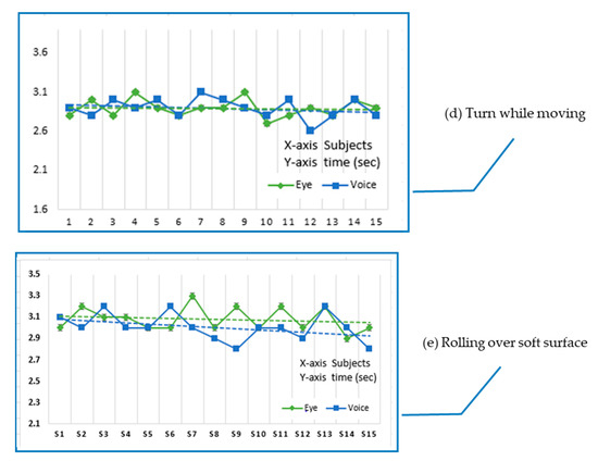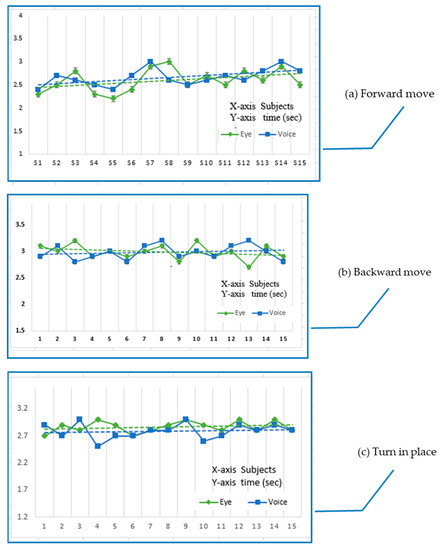 The data obtained from a basic WST-wheelchair skill test are represented graphically in (Figure 10). The presented system was tested with 15 test subjects, in an age range of 20–30 years. All the testing subjects were healthy and were asked to drive the wheelchair via eye and voice control modes separately through a fixed distance of 25 m. All participants operated the wheelchair up to the targeted distance separately for each movement (forward, backward, rollover soft surface, turn left and right). The main goal was to note the system’s response time for both optical and vocal commands, separately.