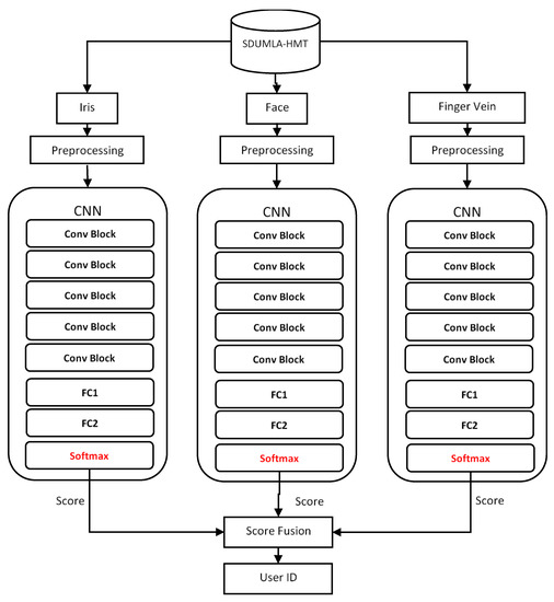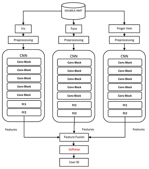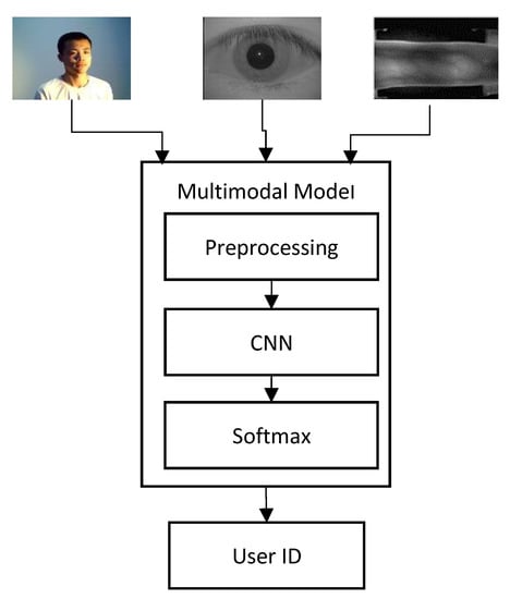 Figure 1. Firstly, the iris, face, and finger vein images of the user are captured. Then, the user identity is recognized by using the multimodal system, which is composed of three fused CNNs for face, iris, and finger vein recognition. Finally, the model produces the user identity.