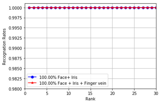 24] based on the score fusion method. As can be seen, there is not much difference between the performance of the two models when using the score fusion method. It is possible to achieve a rank-1 identification accuracy of 100% using our proposed model and previous model.