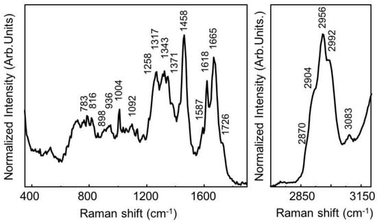 RS is particularly suited for sensing breast cancer because of its sensitivity in detecting biochemical component changes that are associated with cancer, such as changes in lipid and protein levels [35]. According to a report, 30% of breast cancers have an amplification of the human epidermal growth factor receptor 2 (HER2)/neu gene or overexpression of HER2 protein [36]. The breast cancer cell lines with various expression levels of the HER2/neu receptor protein such as MDA-MB-231 with HER2–, MDA-MB-435s with moderate HER2+, and SK-BR-3 with HER2+ overexpression was studied using RS [37,38]. To improve the Raman sensing of breast cancer cells differentiation, the normalized average Raman spectra of those cell lines were examined and compared. The MDA-MB-231 and MDA-MB-435s cells showed spread morphologies, while the SK-BR-3 cell population contained both round cells and spread cells. The Raman spectra showed a pronounced increase in lipid expression in both MDA-MB-231 and MDA-MB-435s cell lines when compared to SK-BR-3 cell lines. The strong positive differences (at 1265, 1298, 1440, 1656–1660 cm−1) suggested an increased unsaturated fatty acid content in MDA-MB cell lines compared to SK-BR-3 cell lines. The spectral bands at 1265 and 1298 cm−1 are assigned to the =CH− in-plane deformation and in-phase −CH2 twisting motion, respectively.