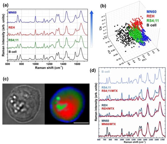Raman spectroscopic analyses of leukemia cells reveals distinct spectral characteristics for each cell line. (a) Average Raman spectra of normal B cells and three B-leukemia cell samples (RS4;11, REH and MN60). The arrow, to the right of the spectra, shows the lymphoblastic B-cell maturation/differentiation stages (The MN60 cell line is the more differentiated). (b) PCA scatter plot for the analyzed cell samples. (c) White-light optical image and Raman image of an MN60 cell. The colors assigned to the Raman image refer to different Raman signals from different locations within the cells: nucleus (red), cytoplasm (dark green), vesicles (light green) and membrane (blue). The scanning area is 30 × 30 μm2 and 45 × 45 pixels; the laser wavelength is 532 nm and the power on the samples is 10 mW. Scale bar: 10 μm. (d) Average Raman spectra of B cells and RS4;11, REH and MN60 B-leukemia cell lines before and after the chemotherapic treatment (MTX at 1 mM for 72 h). The Raman spectra are offset for clarity. Reproduced with permission from the Springer Nature publications and Wiley publications, respectively [8,31].