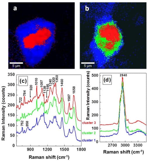 Raman mapping images obtained by Cluster Analysis software of (a) untreated MCF-7 cells and (b) EGF-treated MCF-7 breast cancer cells, respectively. The individual normalized averaged Raman spectra associated with each cluster with fingerprint region (c) and in higher wavenumber region (d). The same color code is maintained for images and for spectra. Reproduced with permission from the SAGE publications [41].