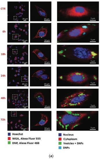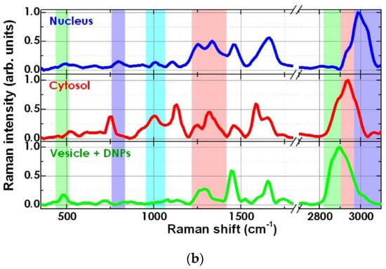 RM does not require labelling, and therefore cellular uptake of the DNPs can be probed without chemical/charge alterations in their surface. The RM results were compared with confocal fluorescence analysis (Figure 4a). Each Raman image was obtained by raster scanning the cell with a laser at 532 nm and recording a 2D array with a step size of 0.5 μm of Raman spectra on a selected area (about 2000 spectra for each image) [42]. Each Raman spectrum was acquired with an integration time of 0.5 s and background-corrected using a polynomial fitting approach. The multivariate curve resolution–alternative least square (MCR-ALS) method was used to obtain false-colour Raman images. This method is in-house algorithm, which generates loadings similar to spectra, which are easier to chemically/physically code. The spectra/loadings of different components of the cells were converted into spatial distribution maps and translated into brightness pixels in the cell image. For each step, three or more cells were randomly analyzed, and the imaging analysis was repeated three times. In Figure 4b, MCR-ALS spectra corresponding to nucleus (blue), cytosol (red), vesicle + DNPs (green) are shown [42].