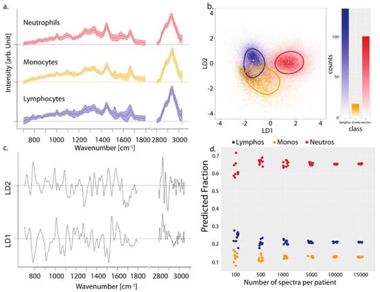 Three major leukocyte types, such as neutrophils, lymphocytes, and monocytes were isolated from four healthy volunteers to establish a model for the identification of cell types in mixed populations by HTS-RS combined with partial least-squares-linear discriminant analysis (PLS-LDA) classification models. For this study, the total number of acquired Raman spectra for four volunteers was 107,732, with a maximum acquisition speed of up to 20,000 cells in less than 4 h. The results, summarized in Figure 5, reveal three completely separated cell clusters.