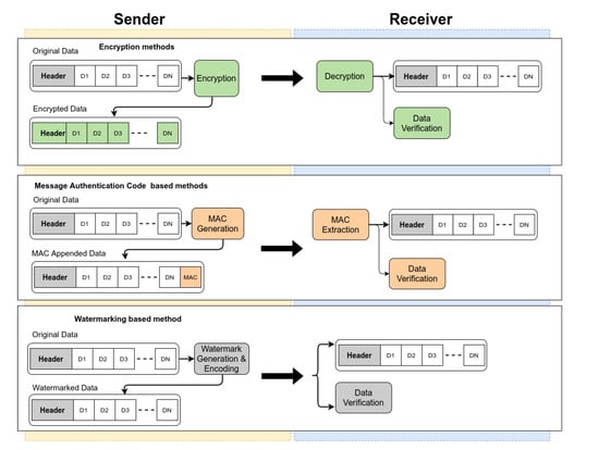 In comparison to the conventional cryptography, watermarking methods are computationally less complex and less resource hungry. Data modified by the watermarking algorithms can be directly used by the end application without having to modify or to clean it before usage. This comes as an advantage for applications that rely on real-time data processing. In Figure 1, different methods that can be used to protect and verify the data integrity in an AV are compared. In a sender–receiver scenario, to protect the data integrity, one can use the encryption, MAC embedding, or watermarking. In both encryption and MAC-based methods on the receiver end, applications cannot use data until the it is decrypted or the MAC is removed. This additional computational step can become a bottleneck in real-time applications. In MAC-based methods, the data payload increases dramatically based on the interface bandwidth. For CAN interface in particular, this method is not recommended as it could double bandwidth requirements [12,16]. Data hiding based watermarking works directly on the host data by perturbing the data by a negligible amount, thereby eliminating the need to increase the data payload and network bandwidth. As shown in Figure 1, all the three methods have a data integrity verification step in common that can be separated out as an independent process and run in parallel to the algorithms that process the data. Again, in the case of watermarking, this data verification step does not require much in the way of computational resources, unlike cryptography.