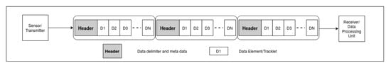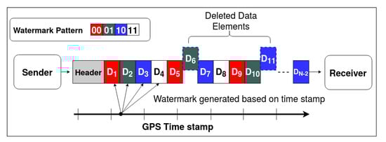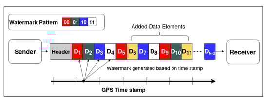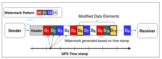 In the proposed framework, a simple algorithm parses through the generated message symbols and applies the corresponding quantizer to the radar position data as per Equation (7). The sender uses the GPS timestamp from a pre-defined interval and is based on the procedure explained in Section 4.1; the watermark is generated and embedded into the data elements of the radar data, as shown in Figure 8. The modified data are transmitted over the selected data transfer interface, for instance, CAN/CAN-FD, with additional meta-data included in the header that acts as a delimiter to the data-elements. The watermark stays with the data irrespective of the data-link or transport protocols used to send the data to the receiver. Additionally, since there is no additional data added in the form of MAC, the interface bandwidth requirements remain the same.