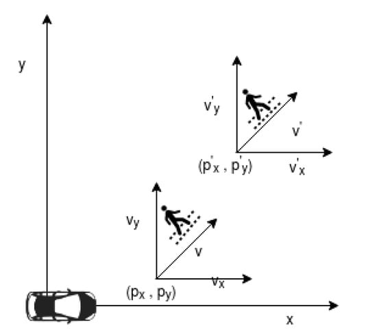 To predict the position of a target, a Kalman filter uses a motion or process model that estimates the future location of the target or object of interest. In this paper, we use a constant velocity motion model as a baseline for target motion estimation. The motion model, as depicted in Figure 4, predicts the position and velocity of the pedestrian at a future time , based on the values at time-step . This position information is provided as a 2D position and velocity vector called the state vector. In the context of this paper, the state vector consists of the predicted position and velocity of the pedestrian represented as
