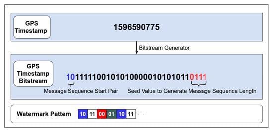 A core component of our integrity verification network is our watermark generation technique. Our proposed model leverages timestamp from GPS sensor data to generate a binary sequence that will be embedded into subsequent radar data frames downstream. The diagram in Figure 6 represents a visual depiction of a GPS sensor timestamp converted into a bitstream. Assuming an architecture supporting little endianness, the two least significant bits (LSB) and the most significant bit (MSB) nibble are parsed and stored in a secured buffer, to be utilized by the sequence generator described in Algorithm 1. The LSB pair stored is used to determine the starting bit pair for the generated sequence. This adds a level of obfuscation to the generated sequence by changing the starting bit pair of the binary sequence to be embedded in the available data elements. In addition, the MSB nibble is converted to its decimal representation and utilized as a seed value to generate a random number to fall within the theoretical maximum for potential data elements generated in one message payload.