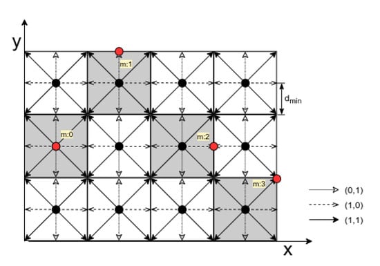 In QIM, the quantization operation uses a unique set of quantizers that result in a reconstruction grid [29]. The dimensionality of the reconstruction grid depends on the message symbol size. If a message has an n-dimensional symbol, it results in a -dimensional reconstruction grid. For example, a binary message , where results in a 1D reconstruction grid. If we extend this concept to a two dimensional dataset such as radar data position vector , a four dimensional message symbol can be used to hide data resulting in a 2D reconstruction grid. Each corner of this grid can be considered as a reconstruction point in recovering the embedded message. In Figure 7 a sample dataset is depicted with different embedded message symbols. After the initial quantization, the position data points that fall within the highlighted polygons are represented by the center of the regular polygon or the black dot . In 2D QIM, based on the embedded message symbol , this center point is moved to one of the eight fixed locations on the boundary of the polygon as represented by the red dot. The minimum value of the separation distance between the reconstruction points , determines the resilience of the framework to the channel noise. This is a configurable parameter in QIM-based watermarking that comes as an advantage when trying to adapt this framework to different end applications. Another advantage being the host-signal interference rejection because of the non-intersecting reconstruction points [30]. The resulting watermarked signal for a 2D QIM can be represented as: