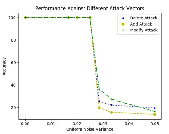 where, is the number of data elements the framework falsely classified as tampered and is the total number of data elements tested. The experiment is repeated at different levels of the additive uniform noise to replicate the channel noise. The results are shown in Table 1. It can be observed that the stayed at when the uniform noise variance , where , in our framework. As the noise variance increases beyond this threshold the false positives increase resulting in higher false alarm rate. It can be concluded from these results that when the channel noise is within acceptable bounds, our framework can achieve detection accuracy with zero false positives.