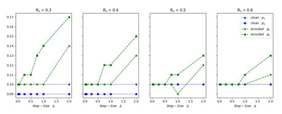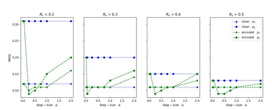 The RMSE results depicted in Figure 13 and Figure 14 show that the 2D QIM embedded radar data can be considered as an added random noise contributor to the overall measurement uncertainty and it can be represented by or in Equation (23). In this experiment, the RMSE values for clean and 2D QIM embedded radar data are calculated at different measurement noise covariance matrix values , , and varying embedded step sizes m. Considering the as the measurement error covariance provided by the sensor manufacturer, the EKF which accepts this radar sensor data should use a covariance matrix value above or equal to the uncertainty. It can be observed from Figure 13, when , the RMSE values of position vector for the 2D QIM embedded data are less than or equal to the RMSE values from clean data for step-size m. With a given range of m and m in the data under test, the results show that the fusion algorithm can recover from position data perturbations of up-to . As the value goes below the , the RMSE of encoded data is less than the clean data only when m. This shows that the embedding-induced distortion at higher step sizes acts like additional uncompensated noise and introduces prediction errors—similar results are observed for the state vector predictions in case of data with measurement covariance matrix value , as shown in Figure 14. It can be inferred from the results that in the case where the measurement covariance , as the embedding step-size increases, the measurement noise value increases and hence the predictions of the embedded data elements are off. However, as the value is increased above the , the embedding-induced distortion is gracefully handled by the fusion algorithm, and we observe low RMSE values even at larger step sizes. This phenomenon can be explained by Equation (23). Here the embedded-induced distortion acts like additive Gaussian noise component. The inherent randomness in the watermark generation and embedding, which acts as noise, adds up to the randomness in the sensor noise. These two noises are independent of each other; hence the resultant effect is additive. This increases the RMSE value of the prediction error when the fusion algorithm does not consider and compensate for this additional noise. These experiments, when repeated at different permissible values of process noise covariance matrix , showed similar results.