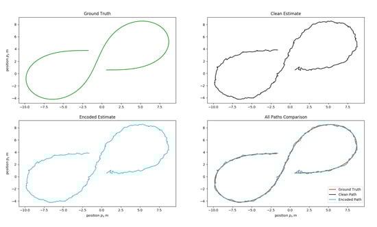 Comparison: EKF path prediction from clean and encoded data at = 0.5, = 0.5 and = 0.01 m.