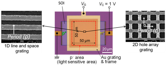 - Satoh, H.; Ono, A.; Inokawa, H. Enhanced visible light sensitivity by gold line-and-space grating gate electrode in thin silicon-on-insulator p-n junction photodiode. IEEE Trans. Electron Devices. 2013, 60, 812–818. [Google Scholar] [CrossRef][Green Version]