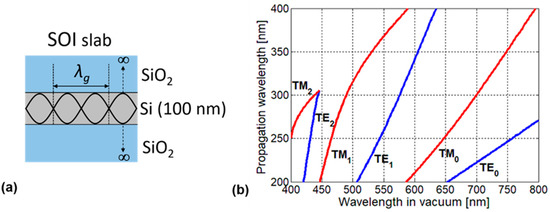 (a) The three-layered symmetrical slab waveguide consists of a 100-nm-thick Si core and SiO2 claddings; (b) Propagation wavelengths of the waveguide modes in the SOI layer calculated by the dispersion relation vs. the free space wavelength.