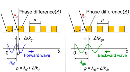 where λgf and λgb are the propagation wavelengths in forward and backward directions. These theoretical peak angles can be designed using the following procedure. At first, the propagation wavelength λg for the free space incident wavelength λ is obtained from the dispersion relation, as shown in Figure 3b. Substituting the calculated value λg for λgf or λgb in Equations (4) or (5), the peak angle θxz of forward or backward waves can be obtained for each grating period at a fixed incident wavelength.