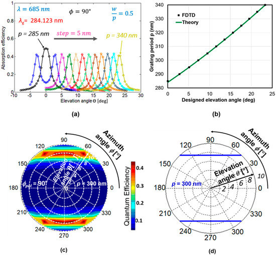 (a) Absorption efficiency as a function of the elevation angle in SOI PD with 1D L/S SP antenna (FDTD calculation) with various grating periods p; (b) Comparison of appropriate grating periods for designed peak elevation angle estimated by FDTD method and phase matching condition. (c) Calculated spatial pattern of absorption efficiency at ϕpol = 90° and (d) theoretical spatial pattern of peak incident angles based on the phase matching condition. Grating period is fixed at p = 300 nm.