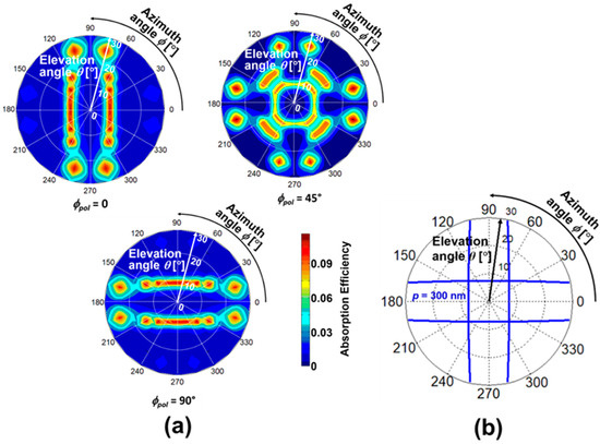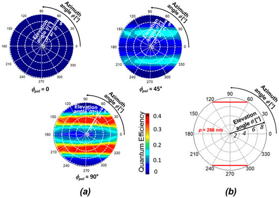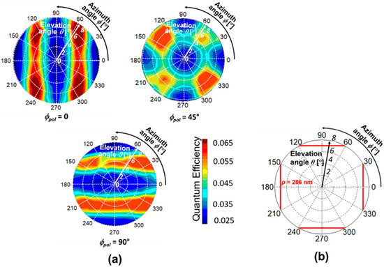 Here, the type of SP antenna was changed to a 2D hole array, and its spatial pattern depending on incident polarization is discussed. As discussed in the previous subsection, the FDTD calculation was performed before obtaining measurements for the PD with a grating period of p = 300 nm and SOI thickness of tSOI = 100 nm. Figure 8a shows the spatial pattern for different polarization of ϕpol = 0, 45°, and 90°. In the cases of ϕpol = 0 and 90°, the FDTD spatial patterns have two-fold symmetry in the vertical and the horizontal directions, respectively. However, in the case of ϕpol = 45°, the spatial pattern with four-fold symmetry appears. This pattern may be caused by the superposition of the patterns of ϕpol = 0 and 90°. The peak elevation angle trend in ϕpol = 90° is the inverse of that of the ϕpol = 0 as the azimuth angle increases. Thus, peak angle sensitivity is highly symmetric with the parallel, and perpendicular calculation is also further expanded to predict the 2D angular distribution and plotted in polar coordinates with the spatial pattern representation, as shown in Figure 8b. The elevation-azimuth angular information mapping by the theory and numerical predictions were in good agreement, ensuring that the peak angle appears based on the optical concept and phase matching condition.