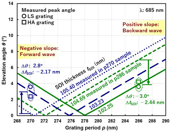 Comparison between measured peak elevation angles (circles and squares indicate LS and HA grating, respectively) and theoretical lines based on the phase matching condition. Samples with the grating periods p = 270 (blue) and 286 (green) nm have different measured SOI thicknesses tSOI = 105.40 and 104.69 nm, (dotted lines) respectively. Theoretical lines for measured and estimated (solid lines) SOI thicknesses for p = 270 and 286 nm are shown. The arrows indicate the shift of measured angles from the estimated ones.